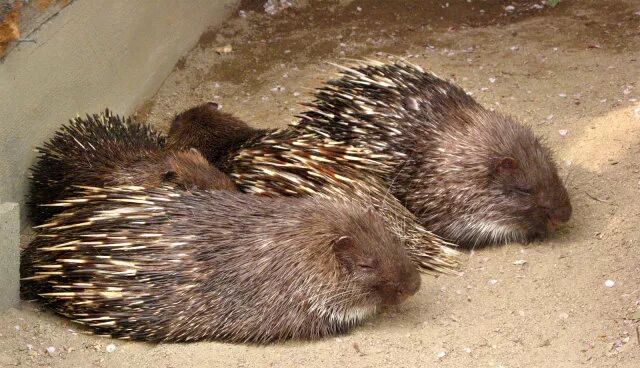 年少的马来豪猪像个圆头圆脑的短毛鼠,身上的刺也又短短的;长大以后就变成了莫西干头大耗子,后半身长满了尖锐的长刺。
