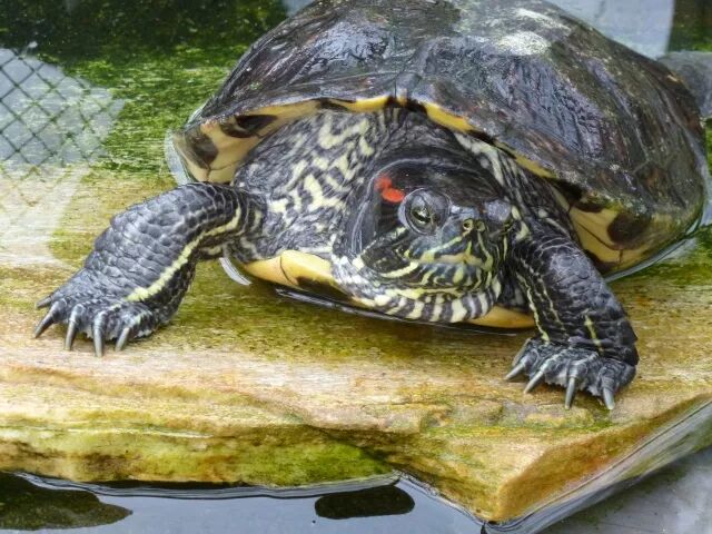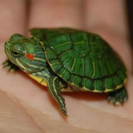 同样因为小时候萌被当作宠物的还有红耳龟,也就是一般说的巴西龟。它们小时候,那可真是字面意义上的花花绿绿,每一块龟甲都有深浅不同的花纹,眼睛头面还有鲜艳的红斑。