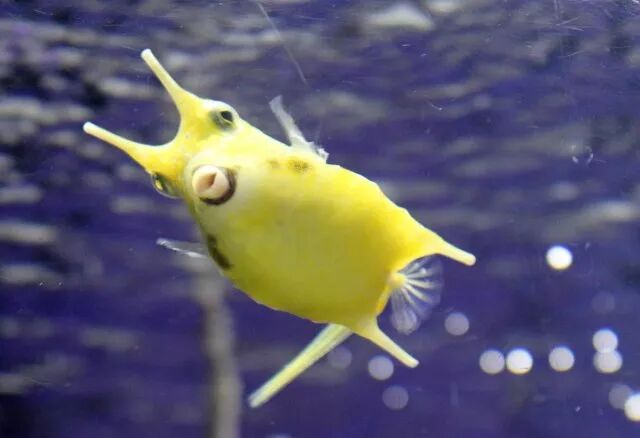 箱鲀科里会越长越残的种类还有不少,比如角箱鲀。小时候比粒突箱鲀还可爱,有人曾经拍到它cos皮卡丘的正面照!小角箱鲀头顶和腹部有一对棘,肤色嫩黄,全身有小白点,嘴边一圈黑,正面看上去好像在傻笑。