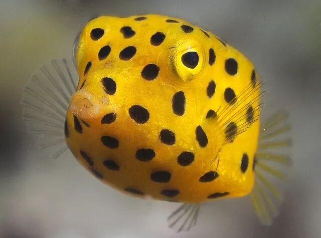 粒突箱鲀小时候可是童星,在水族馆中人气极高。圆滚滚的身体外面覆盖有骨板,通体亮黄色,布满黑色波点,嘴嘟起来向前突出,虹膜是深邃的蓝色。<游起泳来尤其萌,戳这看>