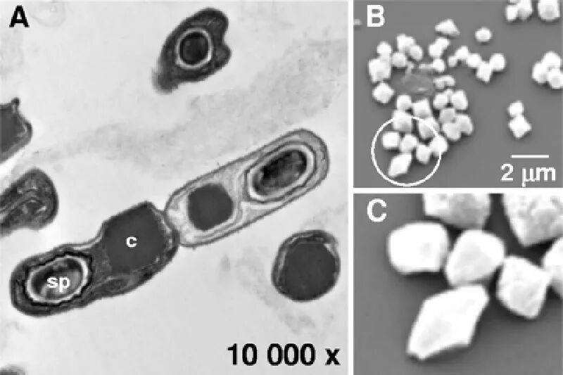 电子显微镜下的苏云金芽孢杆菌。图A中的c对应的就是细胞内的晶体。图片:Swiecicka I et al. (2008) Appl. Environ. Microbiol. 74(4):923-930