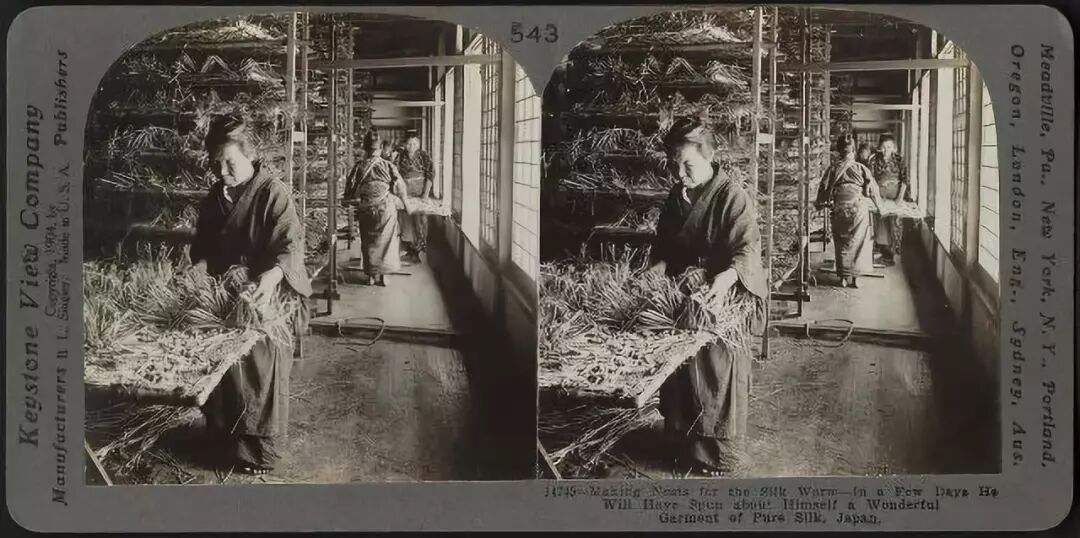 19世纪20世纪之交的日本桑蚕养殖厂,工人正在给准备吐丝的蚕准备结茧场。图片:Boston Public Library
