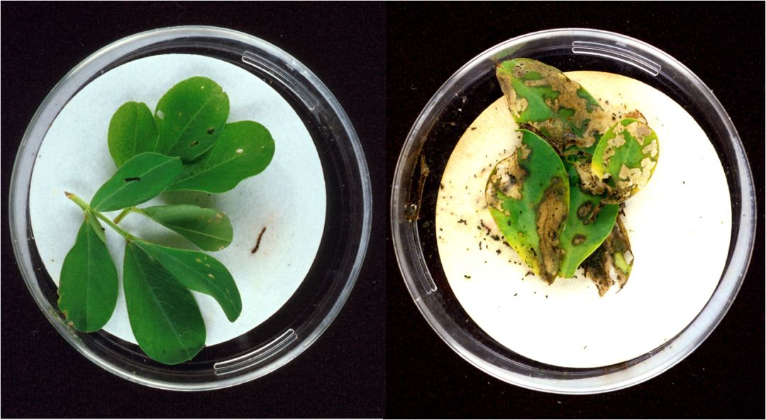 转基因花生叶(左)和普通花生叶片对害虫的抗性对比。图片:Herb Pilcher, USDA ARS / wiki commons