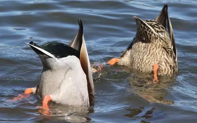 绿头鸭在水下觅食,左雄右雌。图片:cod.edu