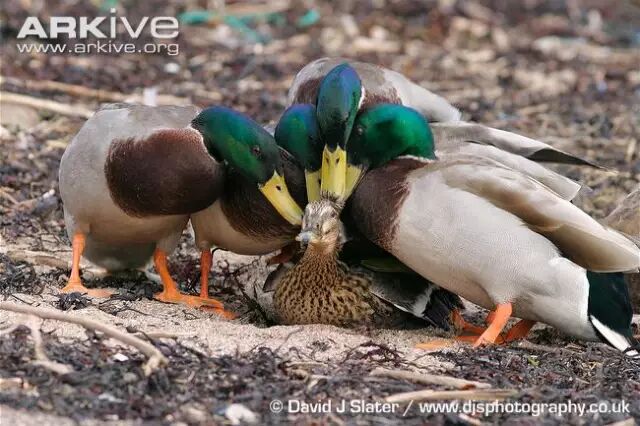 试图跟一只绿头鸭雌鸟交配的绿头鸭雄鸟们。图片:Arkive.org