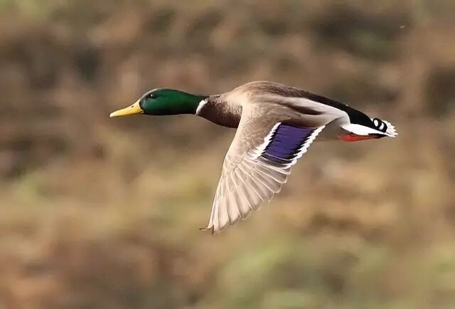 绿头鸭雄鸟飞行姿势,翅膀完全展开时能看见翼镜是由两侧白色边缘并黑色细边和中间的蓝紫色宽矩形组成。图片:birdskorea.org