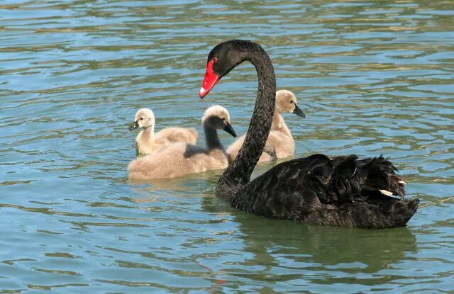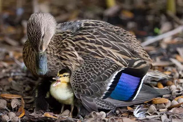 绿头鸭雌鸟带着雏鸟宝宝,翅膀下垂可见到蓝紫色翼镜。图片:imgmob.net