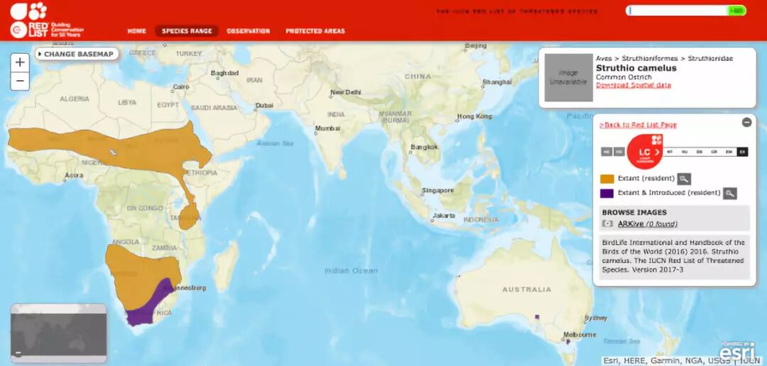 今天,鸵鸟分布在非洲,在利比亚局部灭绝,澳大利亚和非洲的斯威士兰有引入的种群。图片:IUCNredlist