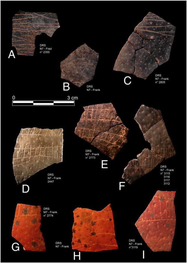 2010年在Diepkloof岩棚发现的带有雕刻符号的鸵鸟蛋壳。上面有两种形式,平行线或是条带。图片:Texier et al. / PNAS(2010)