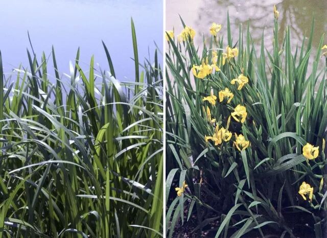 菖蒲科菖蒲属的菖蒲(左)与鸢尾科鸢尾属的黄菖蒲(右),不开花还真分辨不出谁才是间谍。图片:thriftyfun.com & pacifichorticulture.org