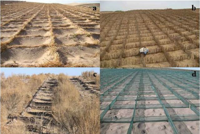 不同材质(稻草、灌木枝、石头和灌木、塑料)的草方格沙障。图片:Guo Z et al. / Sustainability(2014)
