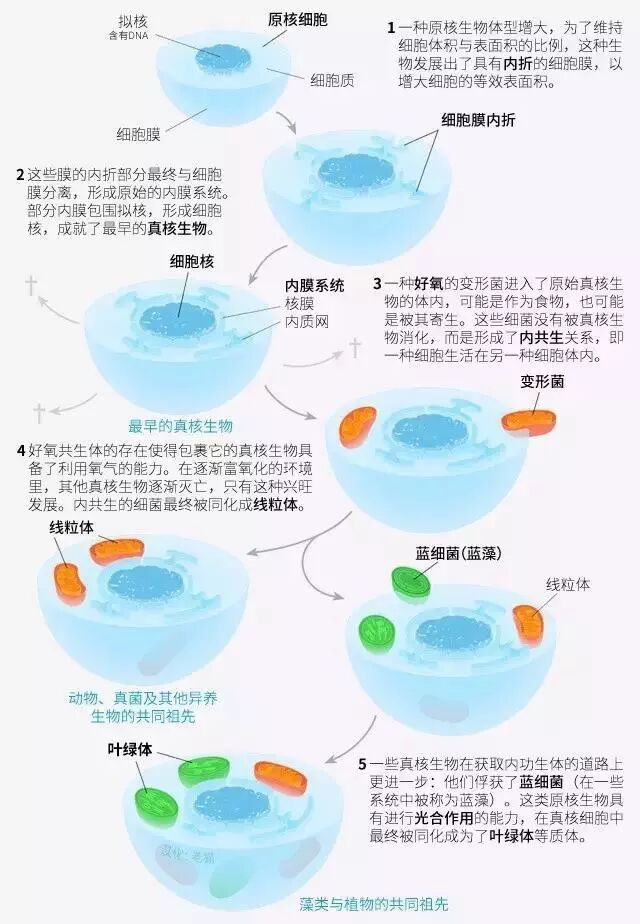 线粒体起源的“内共生假说”——该学说认为,叶绿体也是和线粒体一样起源的。图片:wiki commons/Kelvin Song,汉化:老猫