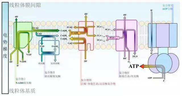 生物狗一定非常熟悉这张图片。这是排列在线粒体内膜上的呼吸链,糖酵解、三羧酸循环等途径产生的NADH和FDA都是在这里最终转化成ATP的。图片:wiki commons
