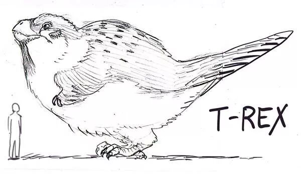 说到羽毛,在越来越多兽脚类恐龙,甚至羽王龙这样的大型肉食龙的带毛化石被发现后,关于暴龙有没有羽毛的争论也是愈演愈烈——有坚持“暴龙不可能是个大鸟、打倒羽毛邪教”的复古主义者,也有干脆把暴龙画成一个大肥麻雀的先锋艺术家。