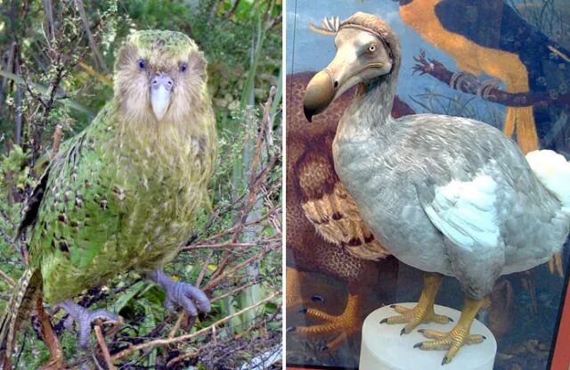 保护状况等级为极危的鸮鹦鹉以及已经灭绝的渡渡鸟。图片:Mike Bodie & BazzaDaRambler / wikipedia