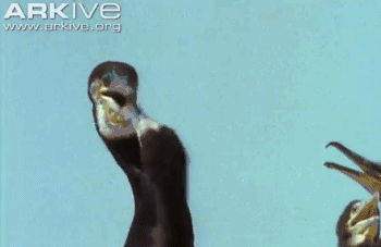 鸬鹚幼鸟正在从亲鸟的喉囊中取食。图片:arkive.org