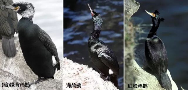 三种鸬鹚。左图:oiseaux.net;中图:Alan Vernon / wikimedia;右图:wikimedia