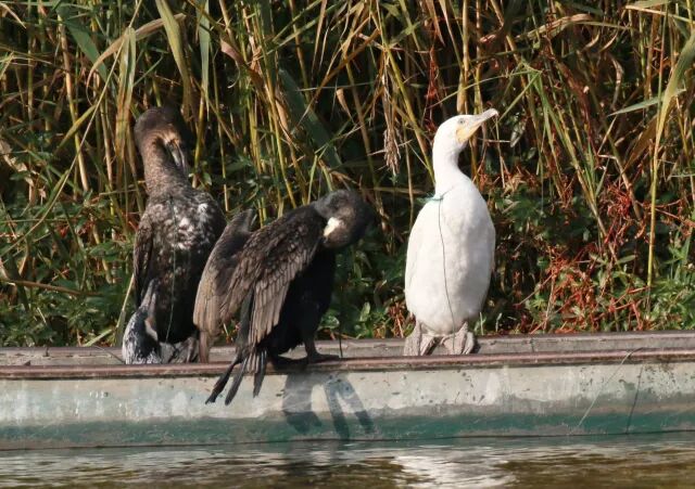 我在云南大理邂逅了一只白化的鸬鹚(右一)。图片:高大向