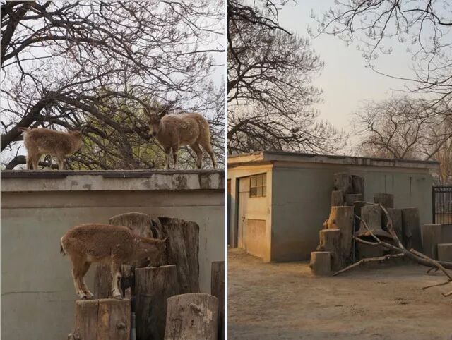 北京动物园的北山羊笼舍让动物们有了上房的途径。