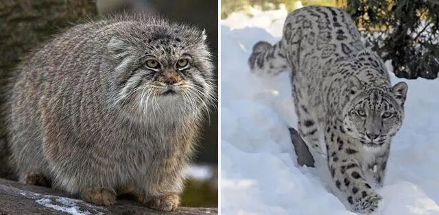 生活在寒冷地区的猫科动物往往看上去更胖一些,例如兔猻(左)和雪豹(右)。一方面他们需要更多的脂肪来应对冬天,一方面他们长而蓬松的毛发也更“显胖”。