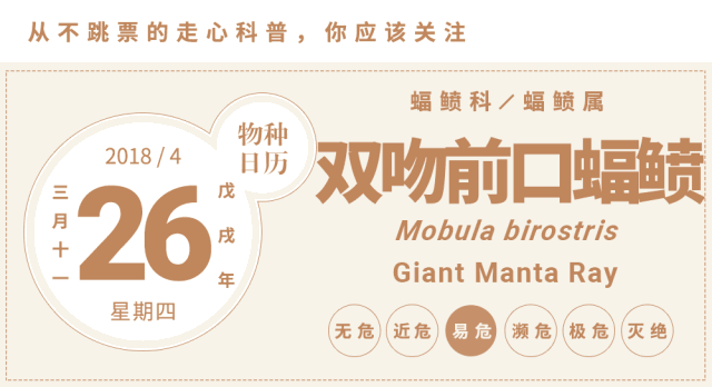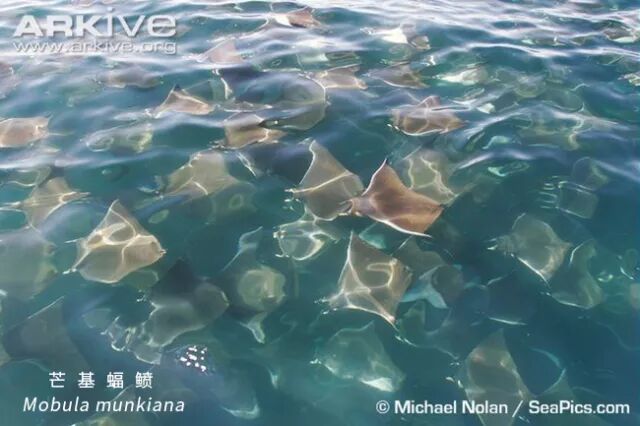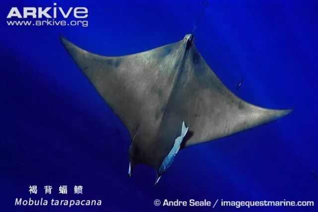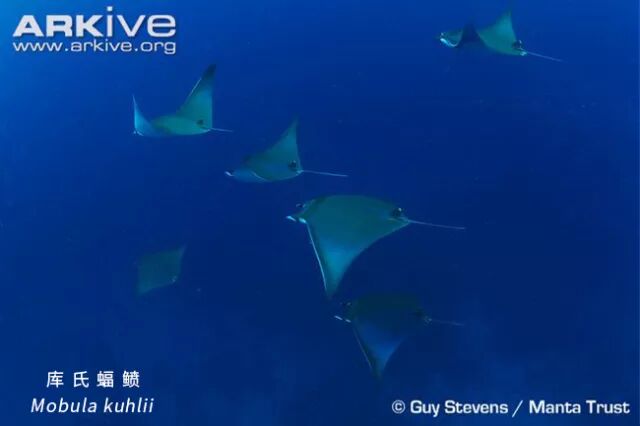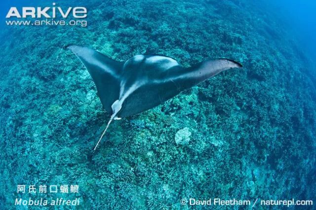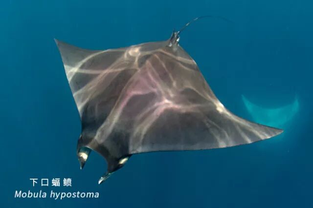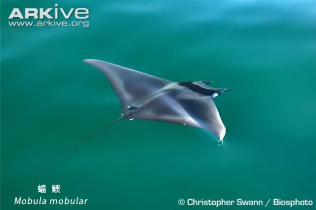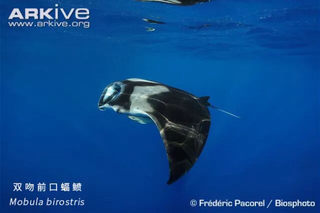 双吻前口蝠鲼属于鲼形目蝠鲼科Mobulidae蝠鲼属Mobula。“蝠鲼”是对蝠鲼属中所有8种软骨鱼类的统称,它们身体宽大呈菱形,因在水中畅游的姿态和夜空中飞舞的蝙蝠相似而得名。
