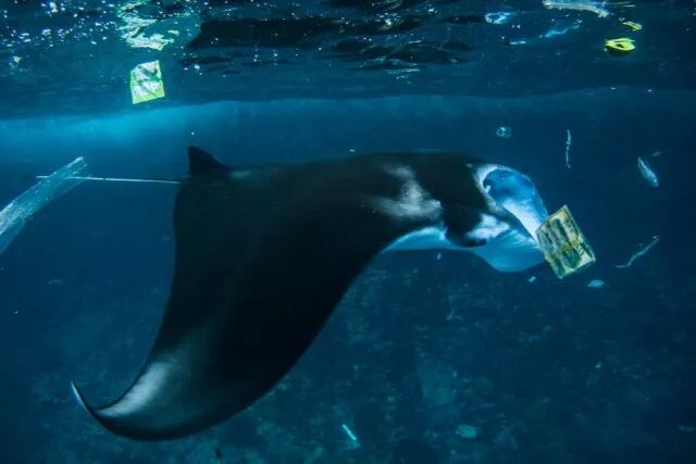 被塑料垃圾包围的阿氏前口蝠鲼。照片:raisedgardenbed.club