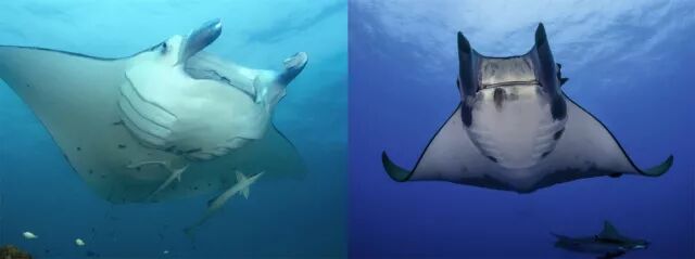 点击放大。在旧的分类方式下,左为端位口的前口蝠鲼属,右为下位口的蝠鲼属。图片:divemagazine.co.uk