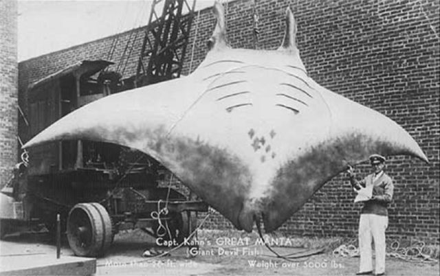 这是1933年捕获的一只体宽6.09米的双吻前口蝠鲼。图片:fishki.net