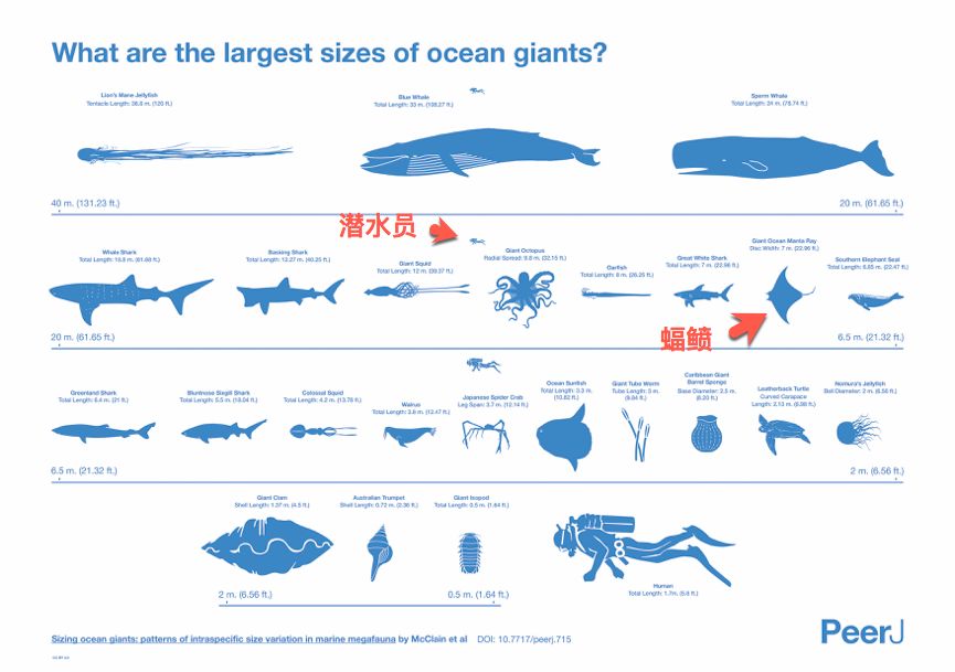 每一行物种大小的参照物是一个1.7米高的潜水员,红色箭头为双吻前口蝠鲼和参照物。图片:McClain et al. / PeerJ(2015)