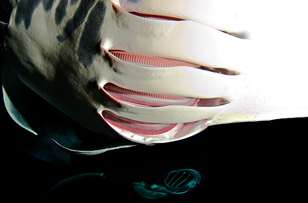 双吻前口蝠鲼吃饭喜欢一口闷——它们会先缓慢地在浮游生物中来回游动,将这些食物聚集起来,然后迅速张开嘴巴一口“喝掉”,这些浮游生物会随着水流在细密的鳃耙中被过滤下来送到胃中。据估计,一只蝠鲼一周需要摄取自身体重约13%的浮游食物为食。