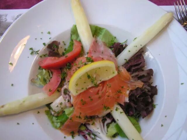 白芦笋搭配生鱼片做成的沙拉。图片:Fruggo / wiki commons