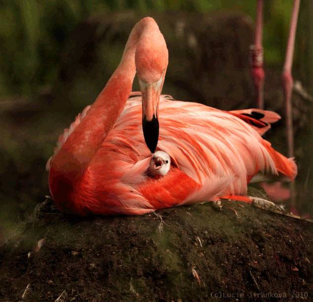 雄性火烈鸟“夫妇”也会抚养幼崽,不过他们的孩子更多是偷来的,有的时候是蛋,有的时候是孵化不久的幼崽。虽然是偷,但火烈鸟爸爸们的照顾十分尽心尽力,可以说是模范家长了。