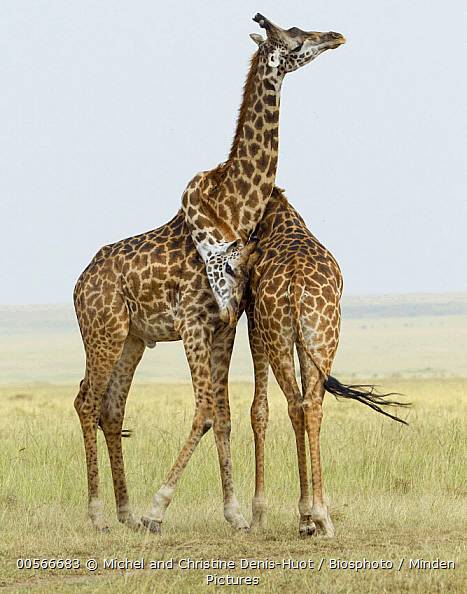 年轻的雄性成年长颈鹿会用长脖子在对方身上轻柔地摩擦,性唤起后会进行模拟交配。