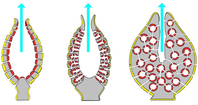 单沟型、双沟型、复沟型海绵结构示意图。图片:Philcha / wiki commons