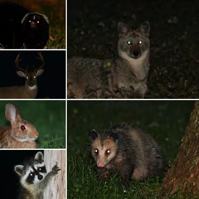 黑暗之中,很多动物会停下来观察,让我们获得难得的机会看清楚它们的模样(从左至右上到下依次为臭鼬、白尾鹿、东部棉尾兔、浣熊、郊狼、北美负鼠)。图片:王放