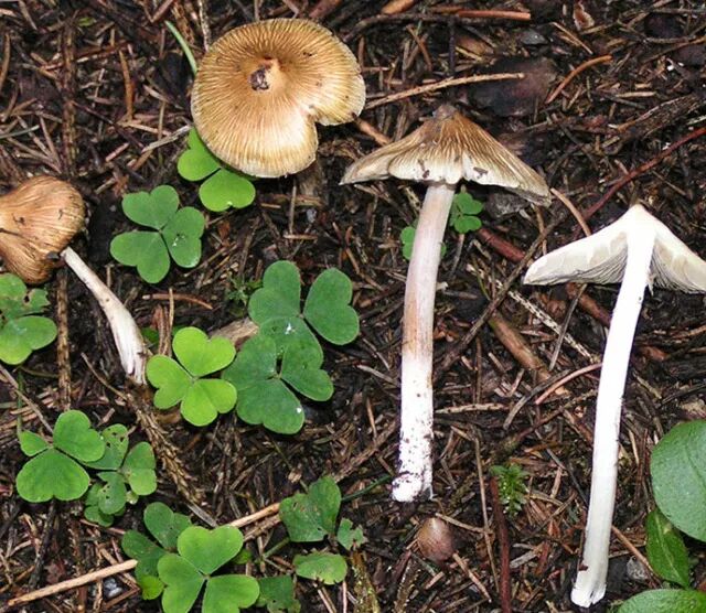 裂丝盖伞Inocybe rimosa(左)与白霜杯伞Clitocybe dealbata(右)是两种能够提取出毒蝇碱的真菌。左图:Eric Steinert / wikimedia.org;右图:Archenzo / wikimedia.org