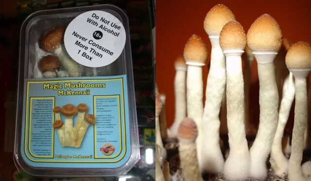 商场中售卖的古巴裸盖菇以及栽培中的古巴裸盖菇。左图:bioweb.uwlax.edu;右图:wikimedia commons