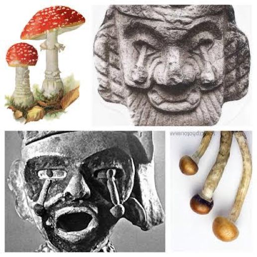 中美洲前哥伦布时期的石雕,人物悬垂的眼球被认为就是蘑菇,上为毒蝇鹅膏,下为裸盖菇。图片:mushroomstone.com