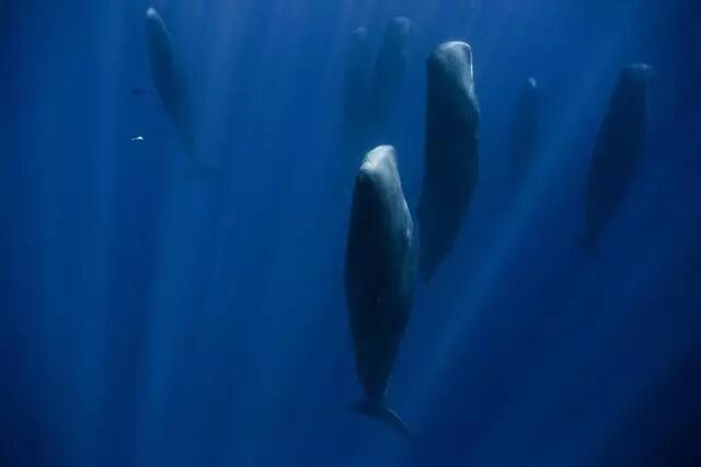 印度洋,几十头成年雌性抹香鲸“站”在水下15米深处睡觉。图片:Stephane Granzotto