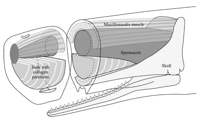 抹香鲸头部构造。图片:Carrier DR et al. (2002) Journal of Experimental Biology. 205: 1755-1763