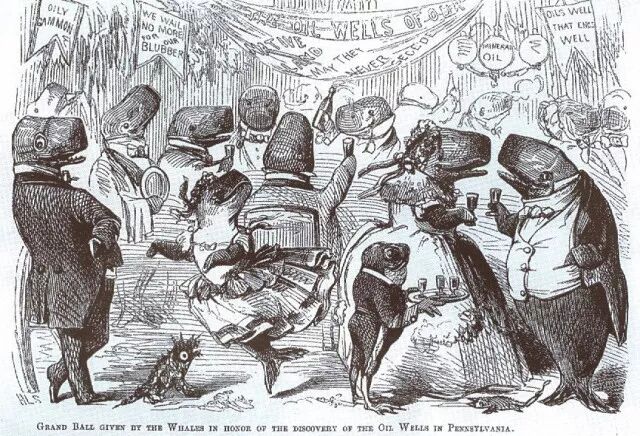 描绘抹香鲸们举杯欢庆宾夕法尼亚发现石油的漫画。图片:Vanity Fair (1861) / wiki commons