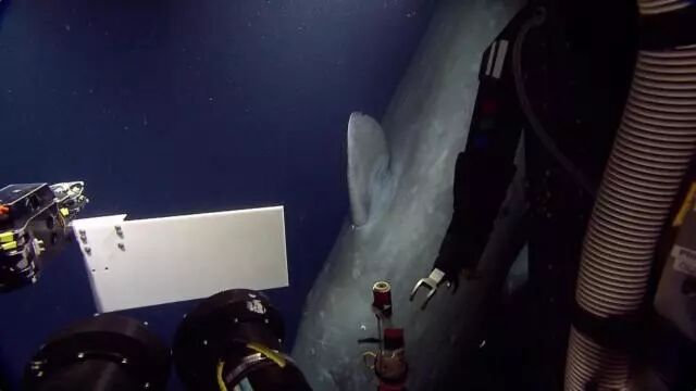2015年,深潜器在水下600米拍摄到的抹香鲸。图片:Ocean Exploration Trust / GISR