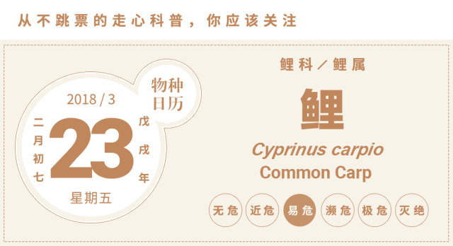 最最狭义上的“鲤鱼”,指鲤形目鲤科鲤属下的鲤Cyprinus carpio,有时也可指鲤属其他成员,而广义上的鲤鱼则可泛指整个鲤科。比如入侵北美的所谓“亚洲鲤鱼”,其实是青草鲢鳙鲤鲫等几种鲤科鱼类的统称。在正式介绍今天日历主角鲤鱼之前,需要先来梳理一下他所在的庞大家族。