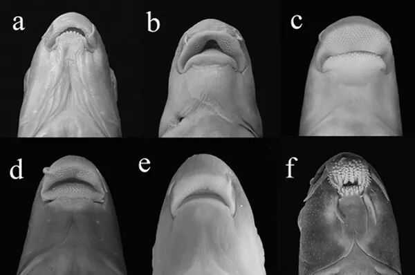 不同鲤科鱼类的口唇部份特征比较,f为卷口鱼。图片:Yanfei Huang et al. Zootaxa 3793 (3): 379–386