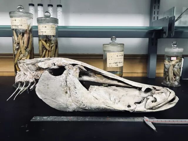 一颗鯮的头骨。据推算,头骨的主人生前生前全长1.8米以上,体重50千克或者更重。鯮是一种凶猛的庞然大物,可惜因为过度捕捞等种种因素,如今销声匿迹,只能寄希望于某地抑或是境外还有些许残存的个体。图片:少侠小黄鸡