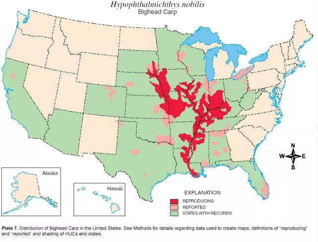 “亚洲鲤鱼”之一的鳙鱼在美国的分布。红色部分为已确定的繁殖区域。图片:USGS