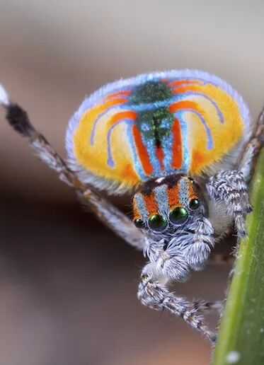 不过,蜘蛛侠到底是被什么蜘蛛咬了才变成蜘蛛侠的,似乎漫威官方也没给出个说法,连蜘蛛侠身上的标志也经常会发生奇怪的变化(有些版本的蜘蛛甚至更像螨虫)。如果一定要在自然界当中找出一种配色鲜艳又活蹦乱跳的蜘蛛的话,那肯定是孔雀跳蛛(Maratus volans)啦!它们尬舞的样子,和小虫蹦蹦跳跳寻找存在感的形象特别像,不是么?