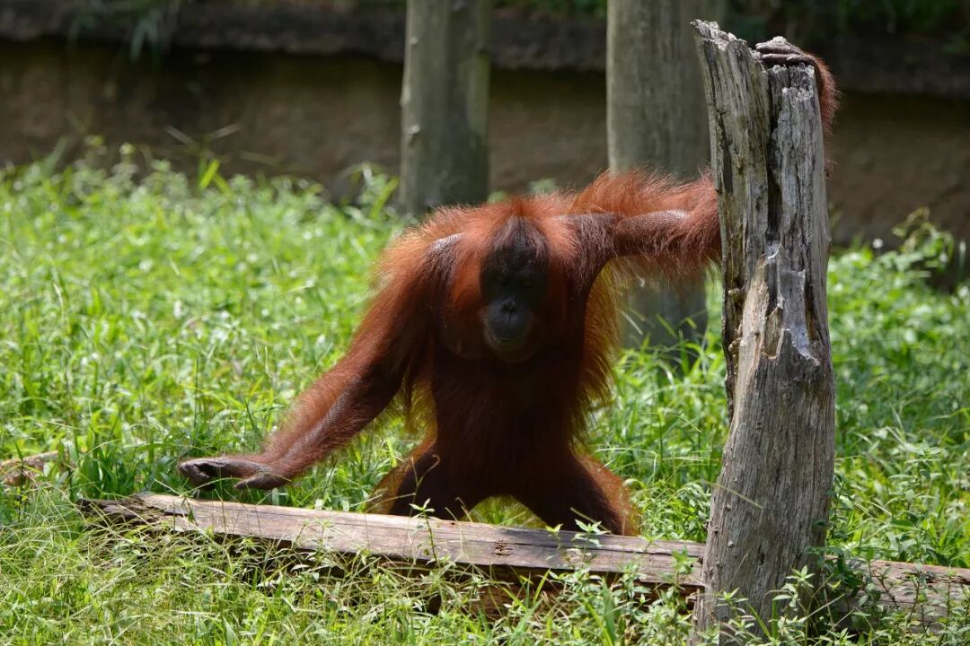 这个个体一直炸着毛,在和一段枯木较劲,一直想把木头推到小河里面去。猩猩的力气是真大啊。