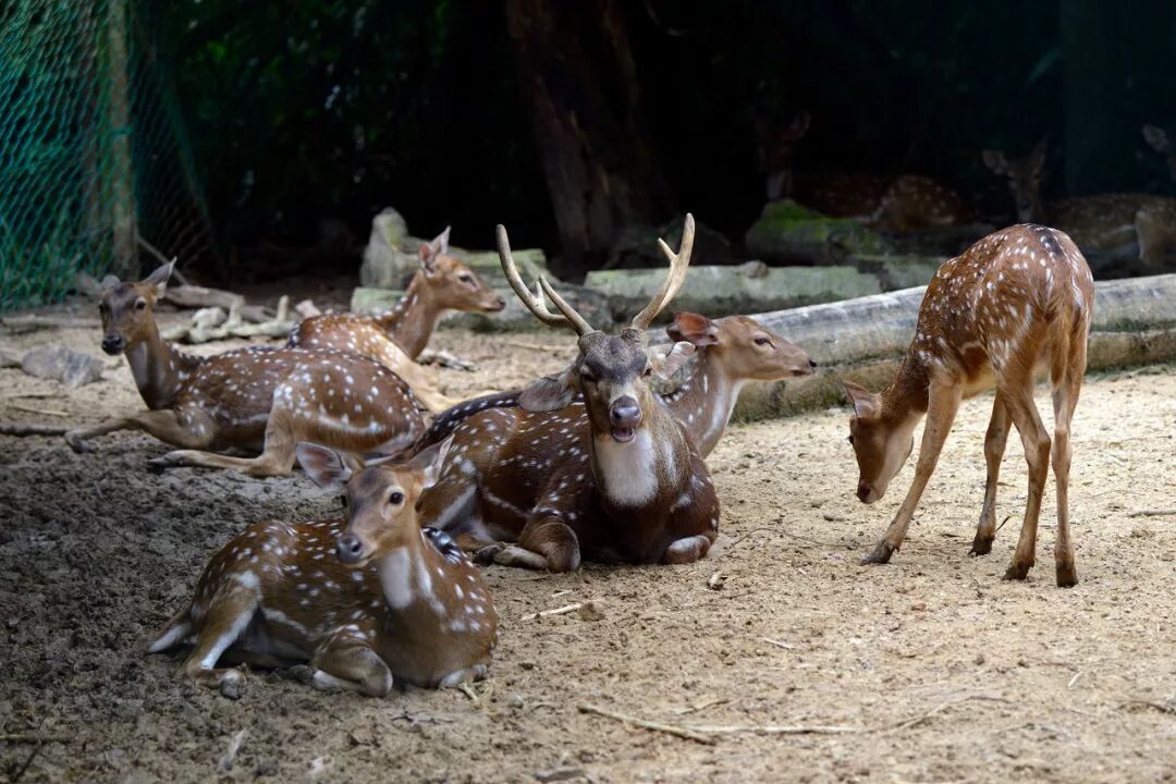 小食肉兽旁边是个白斑鹿(Axis axis)的笼舍。鹿的场馆不错,内有小坡,若干树,场馆周围除了一小块给人的观景台之外,铁丝网周围都种植了一些植物,能够帮鹿避开人类的视线。看起来这帮鹿还是挺怡然自得的。