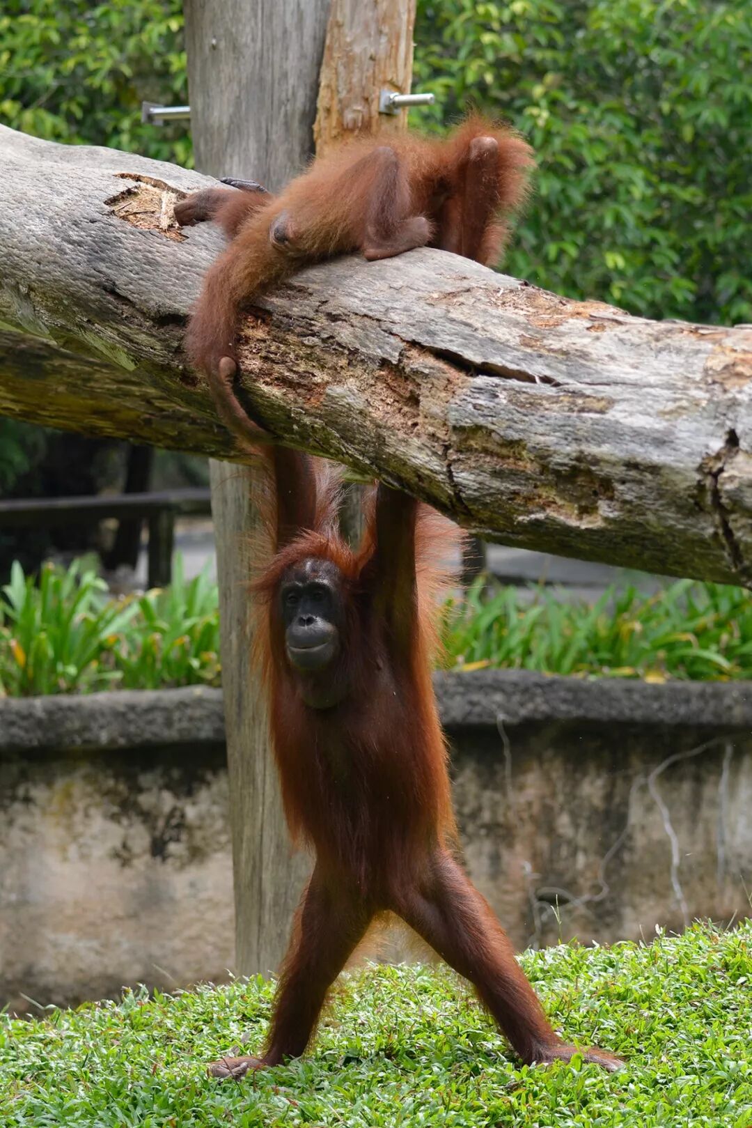 整个猩猩区,有5只以上的猩猩个体,可惜似乎没有年纪大的雄性,没看到大饼脸。猩猩这种独居的动物,一起放在这么一篇园区里好不好我不是很清楚,反正除了母子互动以外,我没看到里面的猩猩们有互动。但行为看上去比较自然。